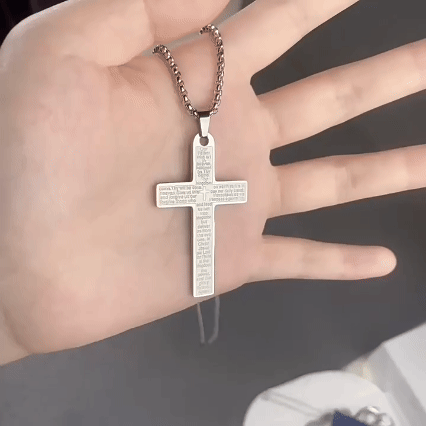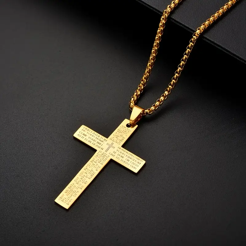 This elegant gold cross necklace features the Lord's Prayer, perfect for faith-inspired fashion. Crafted with precision, it combines spiritual significance with stylish design. Ideal for daily wear or as a meaningful gift. Made from high-quality materials, ensuring durability and shine. Enhance your look while expressing your beliefs.